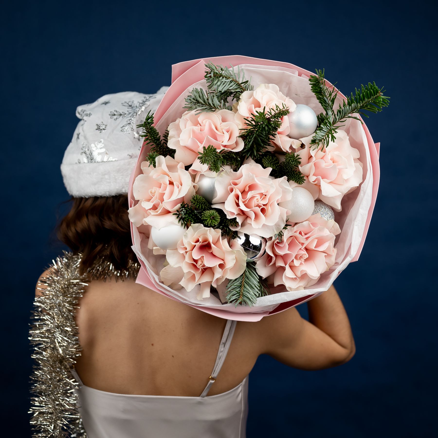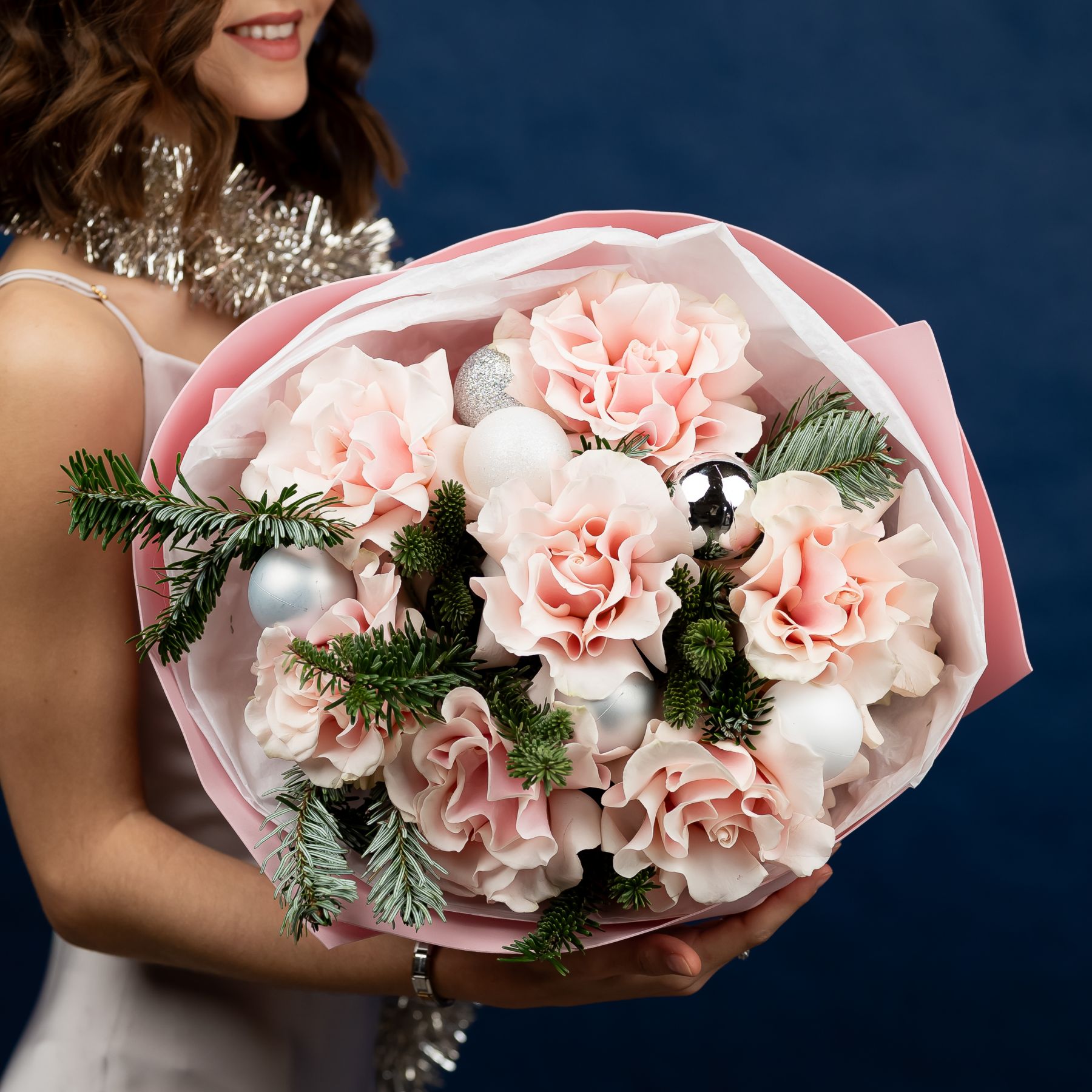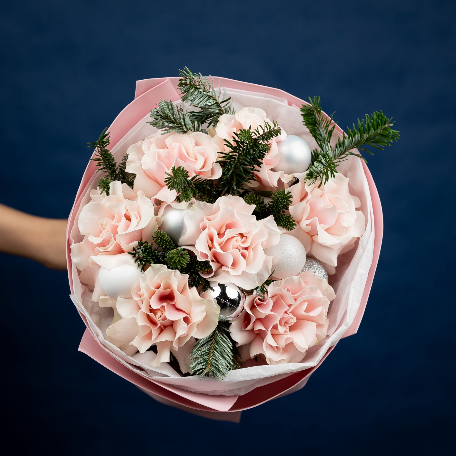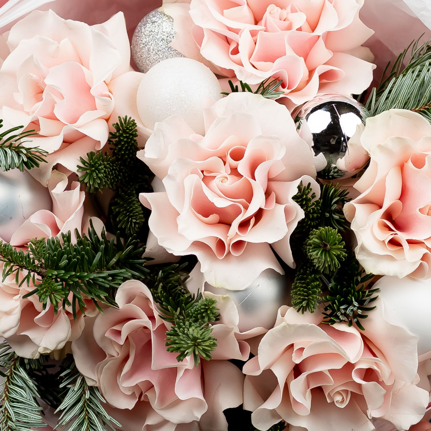 Зимний букет с французскими розами, нобилисом и елочными шарами